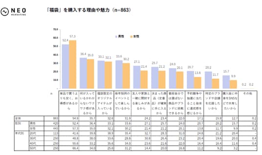 福袋を購入する理由や魅力として、「単品で買うよりも安く、お得感があるから」の理由をあげた割合は、女性(57.3%)が男性(52.4%)よりも高い傾向がみられます。それ以外の理由では、男性が若干多い結果となりました。