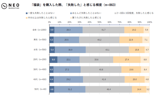 福袋を購入した際に、「失敗した」と感じる頻度は66.8%と最多。年代が上がるにつれて「失敗した」と感じる割合が減少。