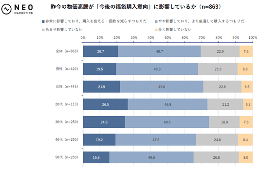 年齢が高くなるほど物価高の影響が小さくなる傾向がみられ、その背景には可処分所得の差があるかもしれません。若年層のほうが、他に優先順位が高い可処分所得の消費先があり、福袋に消費が向かわない可能性があります。若年層をターゲットとする福袋は比較的安価にして、50代は比較的高価に設定するなど、価格の設定方法が鍵になりそうです。