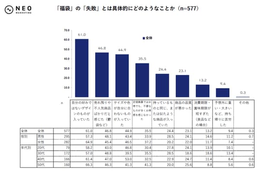 福袋の「失敗」とは、「好み」が61.0%と最多。自分にとって不要なものが入っていると「失敗」と感じる傾向にある。