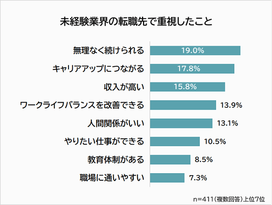 「未経験業界の転職先で重視したこと」を聞いたところ、1位は「無理なく続けられる(19.0%)」でした。2位「キャリアアップにつながる(17.8%)」、3位「収入が高い(15.8%)」、4位「ワークライフバランスを改善できる(13.9%)」が続きます。