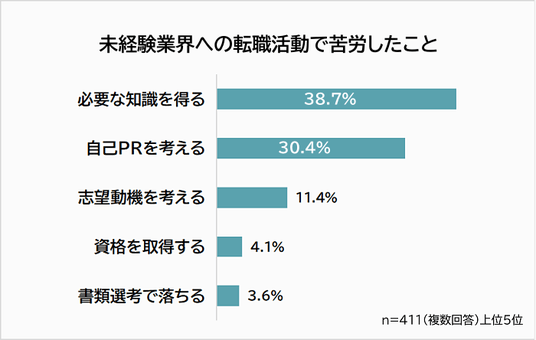 未経験業界への転職活動で苦労したことの1位は「必要な知識を得る(38.7%)」です。2位「自己PRを考える(30.4%)」と答えた人も全体の3割を超えました。