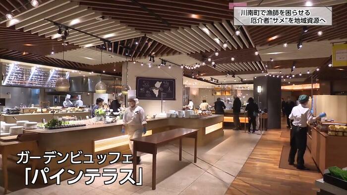 そのシーガイアで最も収容人数が多いレストラン、ガーデンビュッフェ「パインテラス」では、毎日サメを使った料理が提供されている。