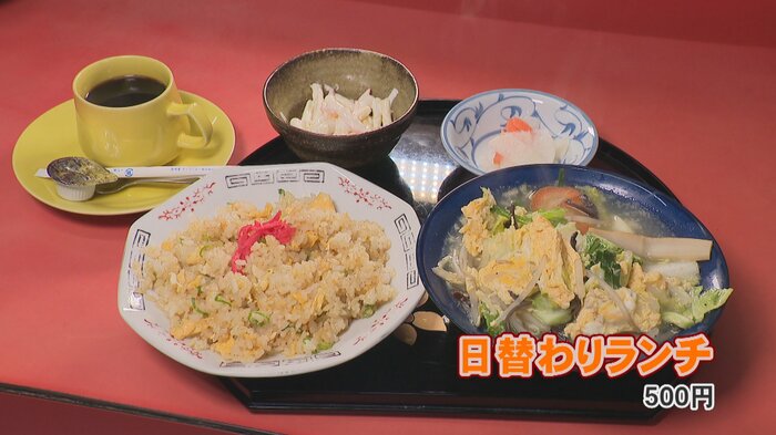 出てきたのは、キャベツや白菜、キクラゲなど具材たっぷりの五目そばと、県産のお米を使ったたまごチャーハン。さらに小鉢とコーヒーがついて、驚きの税込み500円だ。