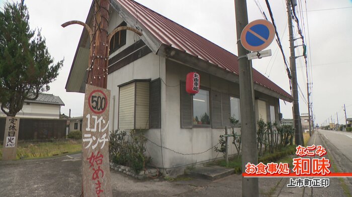 上市町に今年5月オープンした「お食事処 和味」。店の看板には「ワンコインランチ始めました」の文字が大きく掲げられている。