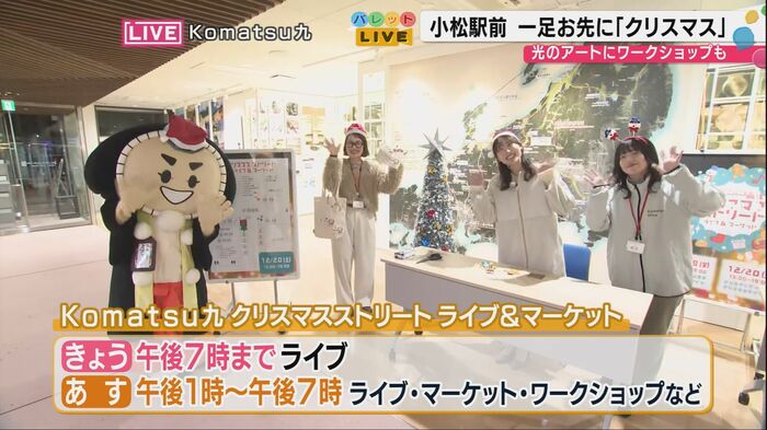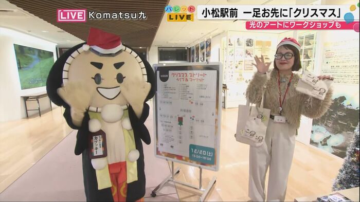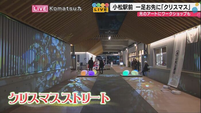 石川県小松市にあるJR小松駅のすぐ隣、Komatsu九(こまつないん)でクリスマスムード満載のイベントが開催されている。「クリスマスストリート」と題されたこのイベントでは、プロジェクションマッピングやワークショップ、マーケットなど様々な催しが用意され、駅を利用する人々や地元の人たちを楽しませている。