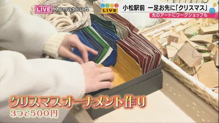 イベントでは様々なワークショップも開催される。加藤アナウンサーはオリジナルのクリスマスオーナメント作りに挑戦。「まず何から選んだらいいんですかね?」という質問に、スタッフの紙谷美郁さんは「こちらの木材か皮かリングから好きな土台を選んでいただいて、その後それにくっつけるパーツを選んでいただいて」と丁寧に説明してくれた。
