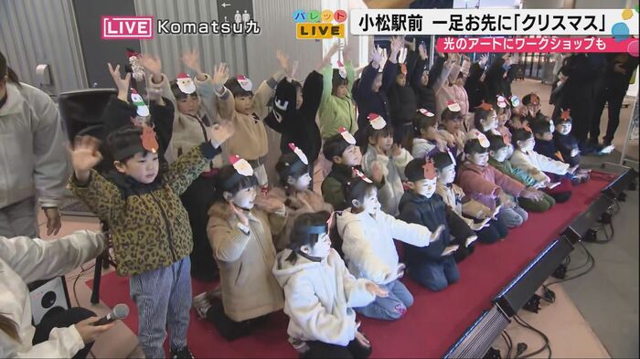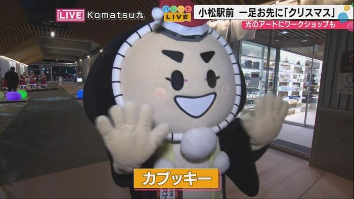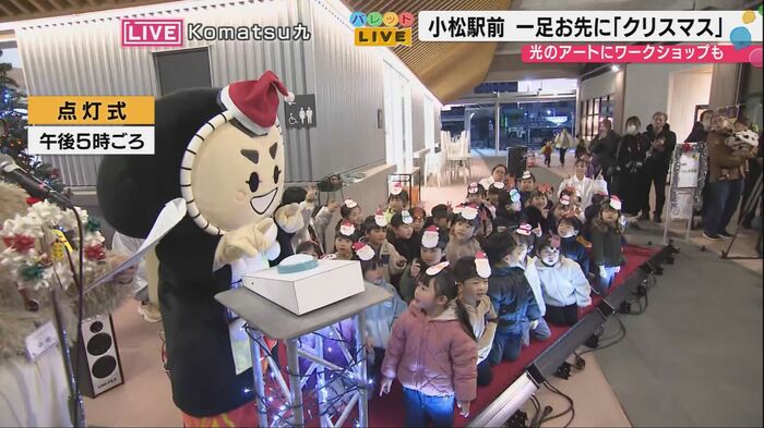 イベントには小松市のイメージキャラクター「カブッキー」も登場。19日午後5時に行われた点灯式では、近くの「こばと保育園」の子どもたちとともに参加し、点灯式のスイッチを押した。