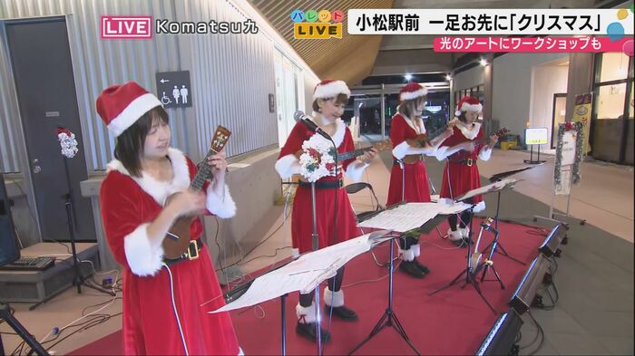 会場では市民アーティストによる生演奏も行われており、取材時にはウクレレの演奏が場の雰囲気を盛り上げていた。光と音楽が融合し、訪れる人々をクリスマスムードへと誘う。
