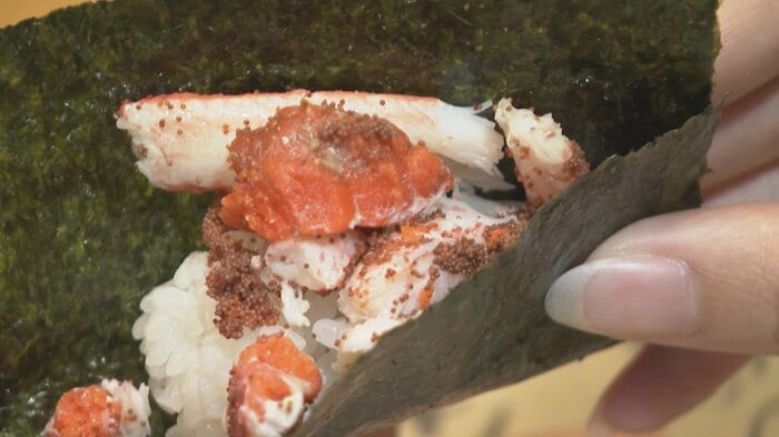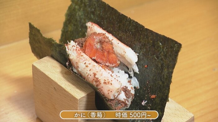 「かに(香箱)」も魅力的だ。これはお客さんのわがままから生まれたという。台ごと持って食べるスタイルで、カニをたっぷり楽しめるよう工夫されている。「軍艦だとちょっと量が少ないんで。そのスタイルだと、たっぷり食べれると思うんです」と酒井店主。内子と外子の風味が濃厚で、プチプチとした食感も楽しい一品だ。