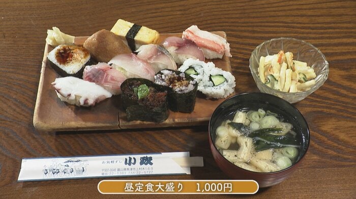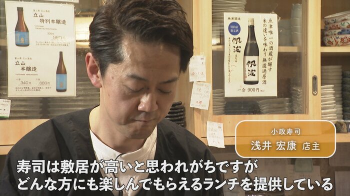 魚津市にある小政寿司は、看板に「お気軽」の文字を掲げ、寿司の敷居の高さを感じさせない雰囲気づくりに努めている店だ。浅井宏康店主は「お寿司は敷居が高いと思われがちですが、どんな方にも楽しんでもらえるランチを提供している」と語る。