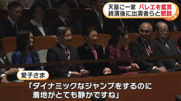 終演後は、芸術監督を務める吉田さんや出演者などと懇談し、両陛下は「とてもカラフルで楽しい作品になりましたね」と感想を伝えられ、愛子さまは「ダイナミックなジャンプをするのに着地がとても静かですね」と感心されていたという。