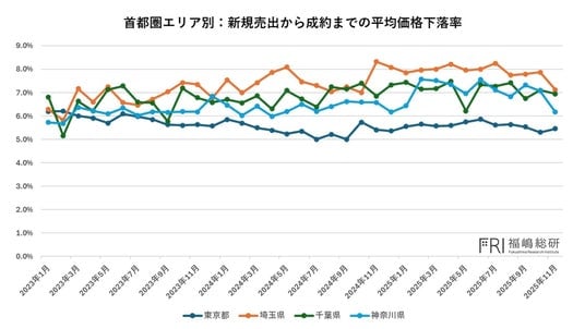 次に、新規売出から成約に至るまでに、平均してどの程度の値引きが行われたかを示す指標を見ると、ここでも東京都の強さは際立っています。一都三県を比較した場合、東京都は値下げ率が最も低く、他の三県との差は年々拡大しています。
