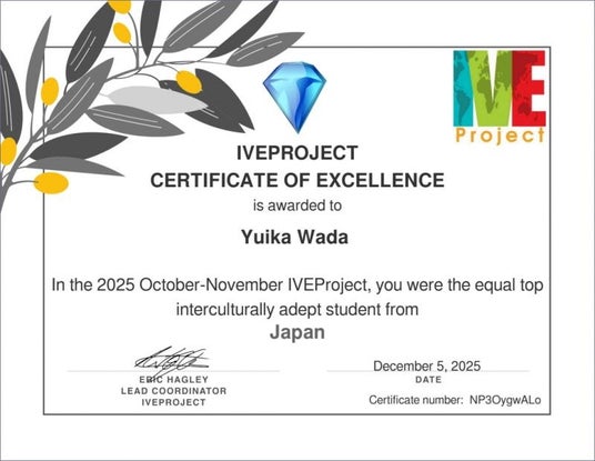国立大学法人岡山大学(本部:岡山市北区、学長:那須保友)のグローバル人材育成特別コース(Gコース)に所属する和田唯海さん(教育学部1年)が、「Internet Virtual Exchange(IVE)」にて「Certificate of Excellence(優秀賞)」を受賞しました。