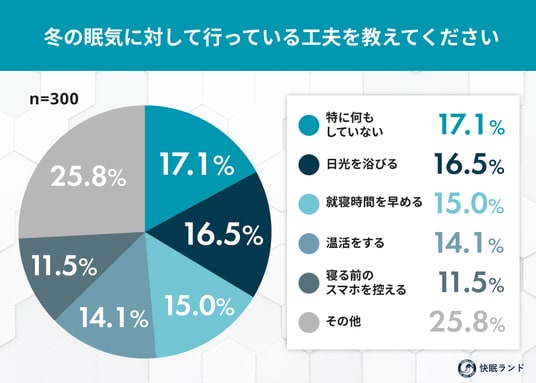 → 約8割が何らかの対策を講じている一方で、最多は「特に何もしていない」という結果となりました。対策内容も分散しており、冬の眠気に対する明確な“正解”が共有されていない現状がうかがえます。