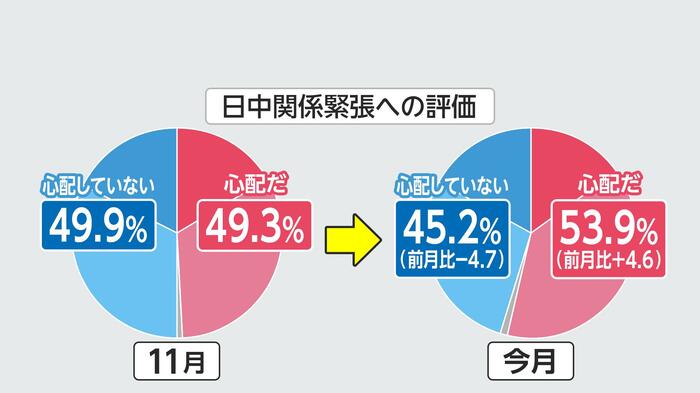 問5 日中関係の緊張状態を心配しているか。(カッコ内は11月の調査)