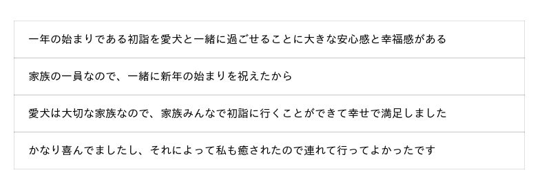 寄せられた回答を見ると、「良かった」と感じた飼い主からは、愛犬を家族の一員として新年の始まりを共に過ごせたことに関する声が複数寄せられました。