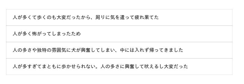 一方で、「大変だった」と回答した飼い主からは、人混みの多さや周囲への配慮、犬が怖がったり興奮したりした点を挙げる声が見られました。