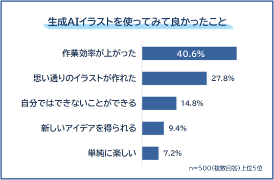 「生成AIイラストを使ってみて良かったこと」のダントツは「作業効率が上がった(40.6%)」、