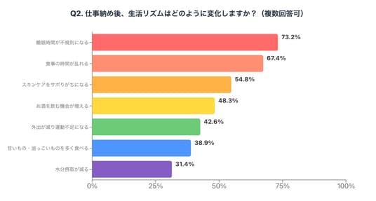 その結果、「睡眠時間が不規則になる」が73.2%で最も多く、次いで「食事の時間が乱れる」(67.4%)、「スキンケアをサボりがちになる」(54.8%)という結果になりました。