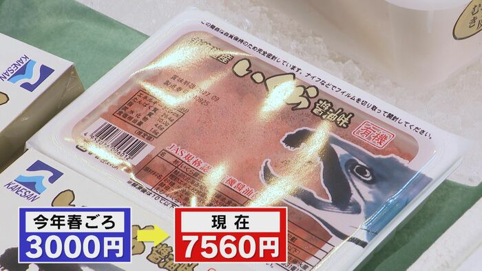 イクラだ。『船津商店』の舩津さんも「イクラはすごく高い。去年と比べて2倍まではいっていないが、1.7~1.8倍ぐらいの値段。こんな値段見たことない」と驚きの表情をみせるほどだ。