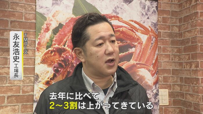 2025年の値段について『TMフーズ』工場長の永友浩史さんは「去年に比べて2~3割は上がってきている。世界情勢が一番大きい原因。カニ自体の漁獲量というよりは、入ってくる量や出ていく量が年々変わってきている」と話す。