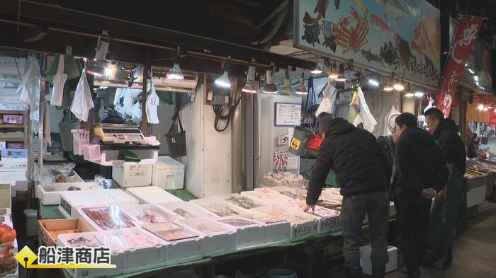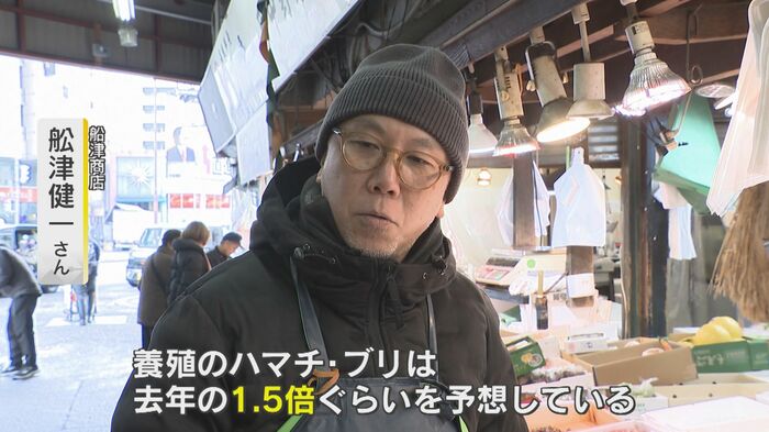 新鮮な魚が並ぶ鮮魚店の『船津商店』。博多雑煮に欠かせないブリの値段を尋ねてみると「養殖のハマチ、ブリは去年の1.5倍ぐらいを予想している」(『船津商店』舩津健一さん)という返答。