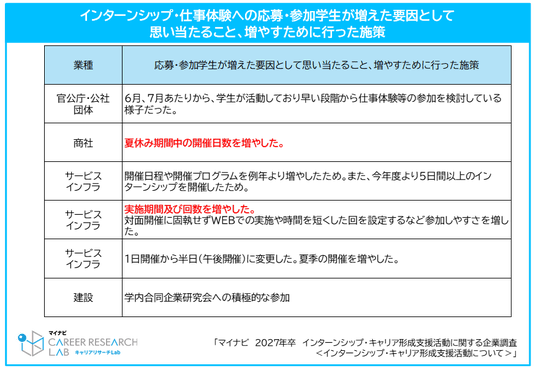 応募や参加が増えたと感じた企業に要因や工夫を聞くと、「実施期間及び回数を増やした」や「夏休み期間中の開催日数を増やした」など実施回数や時期を調整することで、受け入れ可能な学生数の増加を図ったというコメントが見られた。