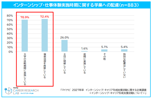 27年卒向けのインターンシップ・仕事体験の実施時期について「学生が学業(授業の参加)との両立ができるように配慮しているか」を聞いたところ、「特別な配慮はしていない」という企業は5.4%と少数に留まり、残りの94.6%の企業は「何かしらの配慮をしている」という結果になった。配慮の内容としては、「複数日程を用意している(72.4%)」が最多で、次いで「大学の休暇期間に実施している(70.9%)」となった。また、「土日に開催している(26.0%)」は約4社に1社だった。