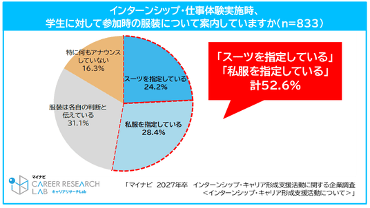 インターンシップ・仕事体験に参加する学生に対し、参加時の服装についてどのように案内しているかを聞いたところ、「私服を指定している(28.4%)」、「スーツを指定している(24.2%)」と回答した企業の割合は合計で52.6%だった。最も多かったのは「服装は各自の判断と伝えている(31.1%)」だった。