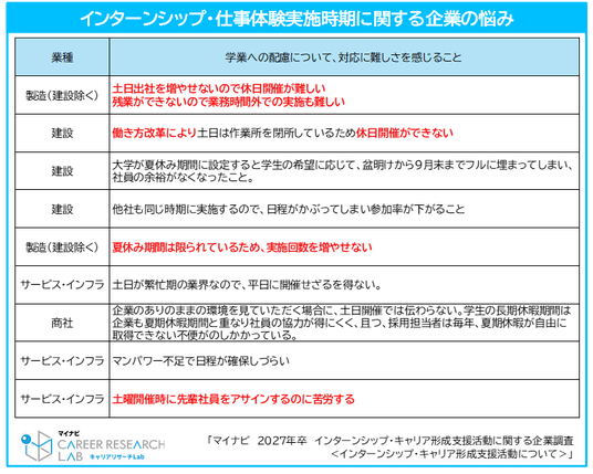 ◆学生が学業の両立ができるように、実施時期について「何かしらの配慮をしている」企業は9割以上。一方、「業務時間外での実施が難しい」「働き方改革により休日開催ができない」声も