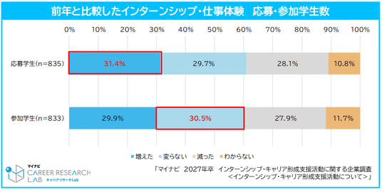 前年と比較して、27年卒インターンシップ・仕事体験への応募学生数・参加学生数はどのように変化したかを聞いたところ、応募学生については「増えた(31.4%)」が最多となり、参加学生については「変わらない(30.5%)」が最多となった。応募数は増えている一方で参加数は前年と変わらない背景には、対面で実施する企業が増加した※ことでプログラム1回ごとの受け入れ学生人数に制限が発生している可能性が考えられる。