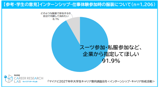 一方で学生に対して行った調査では、インターンシップ・仕事体験時の服装については「スーツ参加・私服参加など、企業から指定してほしい(91.9%)」が9割以上だった。企業としては、服装を指定しないことが学生への配慮と考えている可能性があるが、逆に学生に戸惑いを与えている可能性もある。