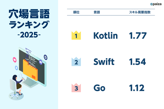 年収が高騰する背景には「企業ニーズは高いが、スキル保有者が少ない」という需給のギャップがあります。2025年の「穴場言語」は2024年と順位が変わらず1位Kotlin、2位Swift、3位Goという結果になりました。
