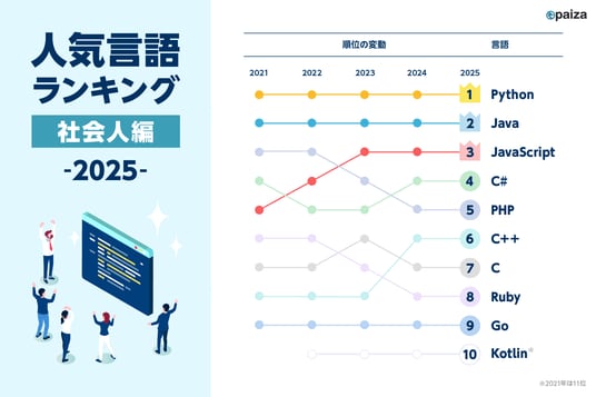 ※人気言語ランキング(社会人編)の調査方法:2021~2025年に社会人会員から提出された「paizaスキルチェック*」のうち、本調査ではランクが測定できるテストのみを抽出。その言語別に受験した受験数のランキングを算出