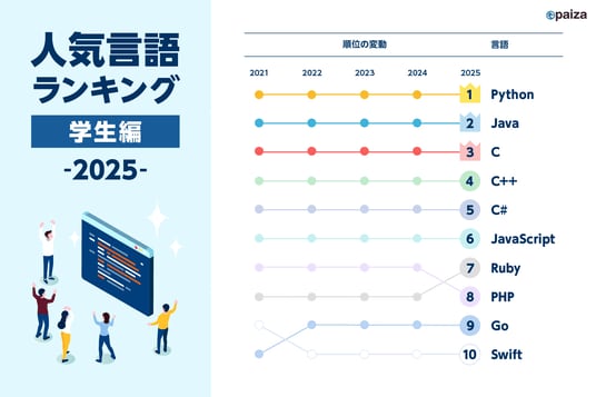 ※人気言語ランキング(学生編)の調査方法:2021~2025年に学生会員から提出された「paizaスキルチェック*」のうち、本調査ではランクが測定できるテストのみを抽出。その言語別に受験した受験数のランキングを算出