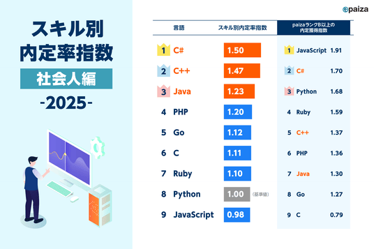 ※「スキル別内定率指数」の調査方法:2025年に「paizaスキルチェック」を受験した人の内定率をプログラミング言語別に算出。「paizaラーニング」にて学生・社会人共に最も学習されているPythonを1としたときの比率を”スキル別内定率指数”として表記。(複数言語でのpaizaスキルチェックも重複カウントとする)※「paizaランクB以上の内定獲得指数」の調査方法:2025年に「paizaスキルチェック」を受験した人の内定率をプログラミング言語別に算出し、paizaスキルチェックで取得したpaizaランクのB以上の内定率をC以下の内定率で除した数値を”paizaランクB以上の内定獲得指数”として表記。