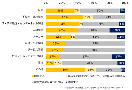 冬季賞与を支給する企業に、昨年と支給額に変動があるかを伺うと、36%が「増額する」と回答。昨年と比較し、増額する企業は12ポイント減少しました(2025年:36%、2024年:48%)。業種別で、昨年よりも増額する企業が多かったのは「不動産・建設関連」(47%)、「IT・情報処理・インターネット関連」(42%)、「人材関連」(40%)でした。