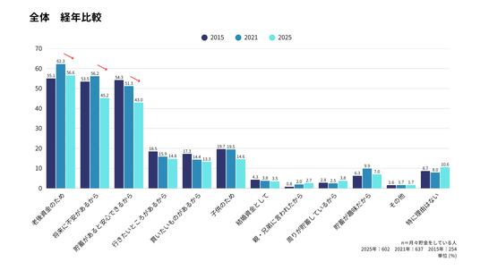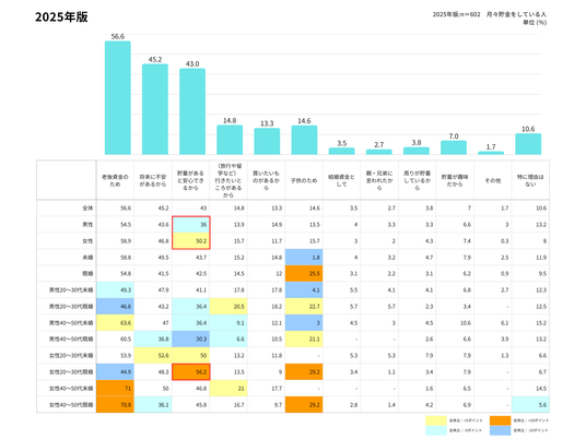 また、2025年の結果では「貯蓄があると安心できるから」の回答において男女差が際立っており、女性のほうが14.2pt高かった。中でも、女性20~30代既婚が56.2%と著しく高く、女性のほうがより将来への保障や安心感を求めている傾向がわかる。