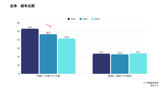 収入に対する「不満計(不満+やや不満)」は2015年の過半数超えから、2025年には約4割まで低下しており、全体としては改善傾向が見られる。