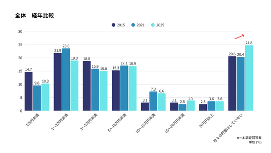 月々の貯蓄習慣については、「月々の貯蓄はしていない」という回答が過去2回と比べ最も高く、全体の24.8%となった。2021年から2025年にかけては4.4pt上昇しており、物価高などの影響で収支の余裕がなくなっている可能性がうかがえる。