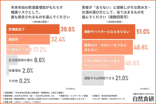 そこで今回、株式会社自然食研(https://www.sizenshokken.co.jp/)は、1.週1回以上飲酒する20~60代の男女/2.内科医を対象に、「年末年始の飲酒と体重増加・肝臓負担」に関する調査を行いました。
