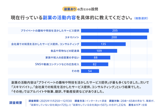 現在行っている副業の業務内容を具体的に聞いたところ、最も多かったのは「プライベートの趣味や特技を活かしたサービス提供」となり、次いで「スキマバイト」、「会社員での知見を活かしたサービス提供、コンサルティング」という結果になりました。この結果から、副業は個人の趣味やスキル、既存の知見を活かすものが主流となっていることがわかります。