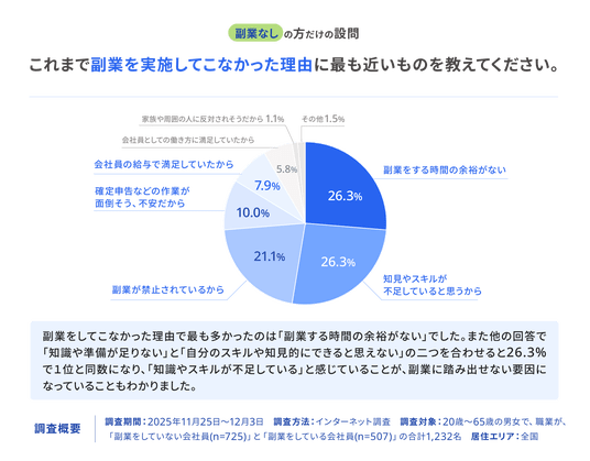副業を実施していない会社員にこれまで副業を実施してこなかった理由について聞いたところ、最も多かったのは「副業をする時間の余裕がない」「知見やスキルが不足していると思うから」であり、26.3%の同率トップの選択肢となりました。この結果から時間的な制約に加え、知識やスキルの不足の認識が副業に踏み出せない主な要因となっていることがわかりました。
