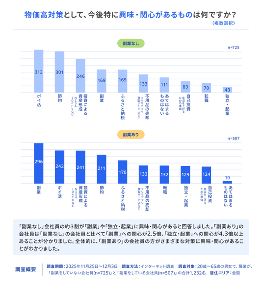 フリー株式会社(本社:東京都品川区、CEO:佐々木大輔、以下「freee」)は、副業を実施していない会社員と副業を実施している会社員を対象とした物価上昇と働き方に関するアンケート調査を実施しました。