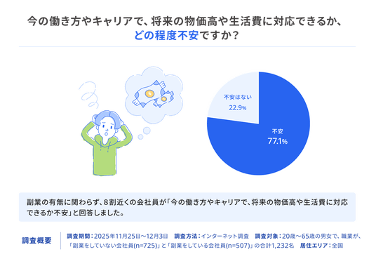 - 会社員の約8割が、日常生活における物価上昇を実感しており、現在の働き方やキャリアで将来の物価上昇や生活費に対応できるか不安を抱いている