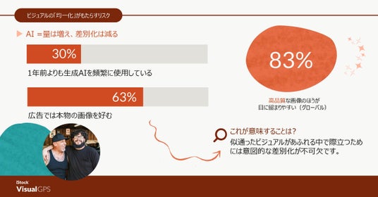 生成AIツールが、プレゼン資料、メール、ウェブサイト、ピッチデック、SNS投稿など、日常的なマーケティング活動に浸透する中で、ブランドが生み出すビジュアルの量は急増しています。VisualGPSによると、世界全体の44%、また日本の消費者の30%が「1年前よりも生成AIを頻繁に使用している」と回答しており、その理由に「簡単に、洗練されたコンテンツを素早く作れる」ことを挙げています。しかしその反面、多くのコンテンツが似通った見た目・印象になってしまっています。VisualGPSの画像テストでは、世界全体の83%が「高品質な画像のほうが目に留まりやすい」と回答しており、AI生成かどうかに関わらず、明瞭さやリアリティ、クラフトマンシップの重要性が浮き彫りになっています。中小企業にとっての鍵は、AIの賢い活用と真正性の両立です。AIはトーンや色、構図の調整に役立つ一方で、リアルな画像は信頼性を補完します。実際、日本の消費者の63%が「広告では本物の画像を好む」と回答しています。