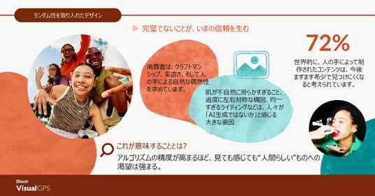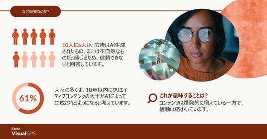 生成AIツールの進化により、コンテンツ制作はかつてないスピードで加速しています。その一方で、ブランド規模を問わず「いかにして他と差別化するか」が大きな課題となっており、ビジュアル戦略の重要性はこれまで以上に高まっています。iStockのビジュアル調査「VisualGPS」によると、現在10人中6人が広告を信頼していないと回答しており、その主な理由として「AI生成」「加工されすぎている」「不自然で本物らしくない」と感じていることが挙げられています。