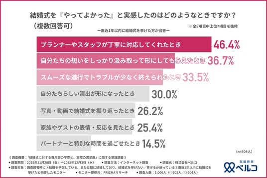 最後に、直近1年以内に結婚式を挙げた方に「結婚式を『やってよかった』と実感したのはどのようなときか」と尋ねたところ、『プランナーやスタッフが丁寧に対応してくれたとき(46.4%)』『自分たちの想いをしっかり汲み取って形にしてもらえたとき(36.7%)』『スムーズな進行でトラブルが少なく終えられたとき(33.5%)』などが上位に挙がりました。