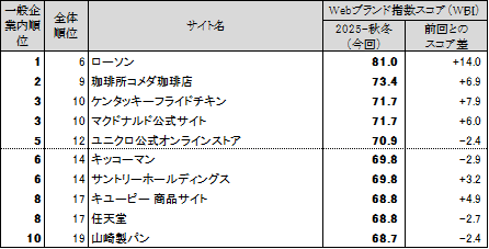■一般企業サイト編は、「ローソン」が首位を獲得。第2位は「珈琲所コメダ珈琲店」、第3位は「ケンタッキーフライドチキン」「マクドナルド公式サイト」